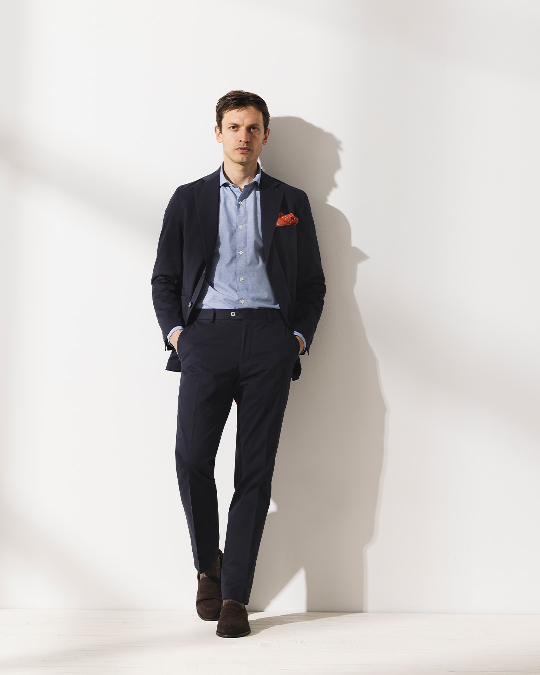 Smart casual: Not an official dress code but generally implies a more relaxed outfit. A blazer with suit trousers or chinos, paired with black or brown shoes.