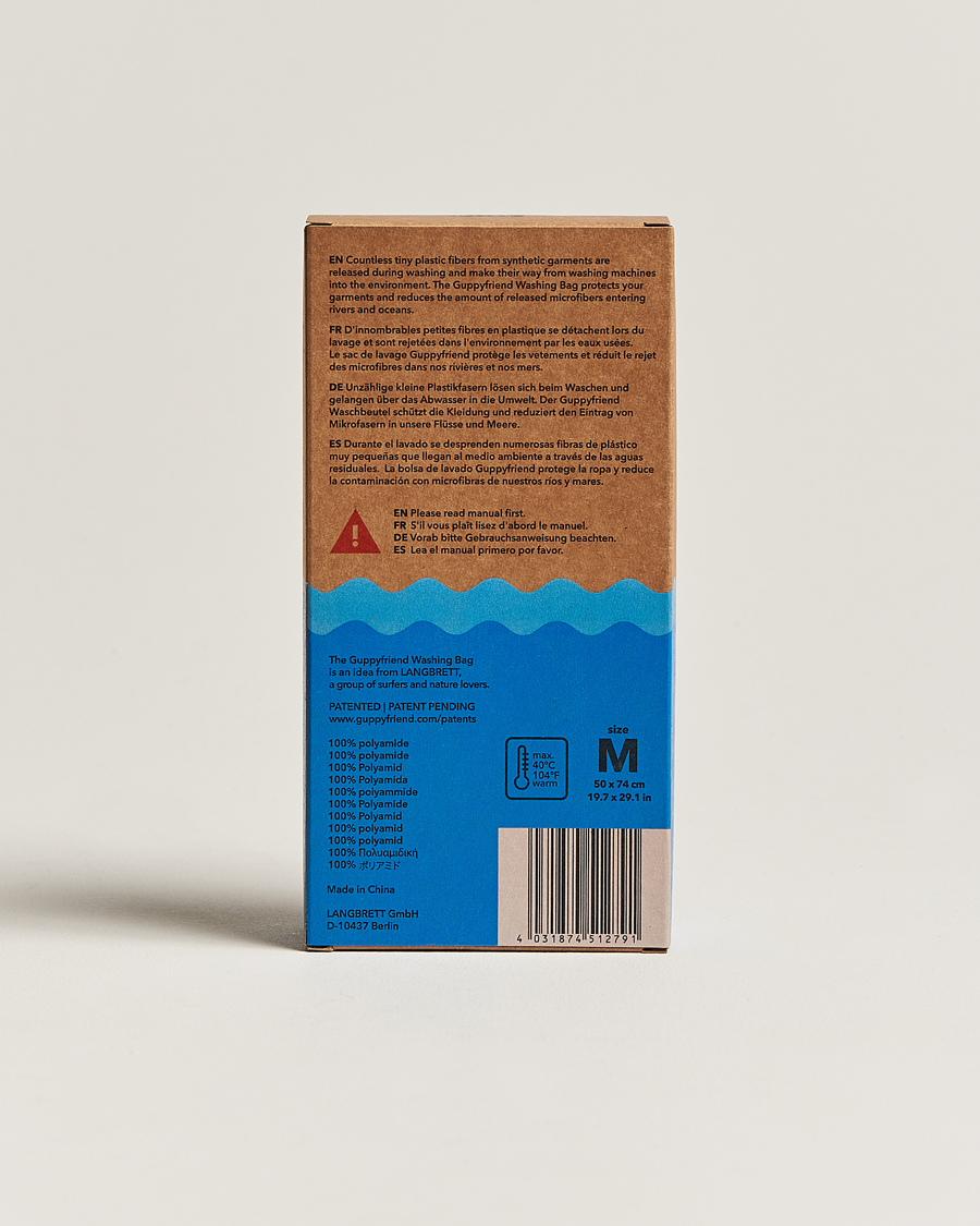 Dans le but de réduire la quantité de microplastiques provenant du processus de lavage et se retrouvant dans nos océans, la division Guppyfriend de LANGBRETT a développé un sac de lavage innovant qui piège efficacement ces microfibres et les empêche d'être rejetées dans l'eau. LANGBRETT est un producteur de vêtements et de chaussures durables et issus du commerce équitable, qui met l'accent sur le choix des matériaux et la contribution à l'économie circulaire. La vente de chaque sac Guppyfriend est reversée à la fondation STOP ! Micro Waste, qui vise à sensibiliser le public aux problèmes causés par la pollution plastique.